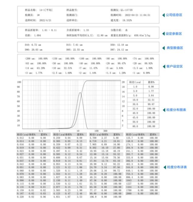 | 顯示模板 | 粒徑區間求百分比,以滿足不同行業對粒度測試的表征方式。徑距、一致性、區間累積等等 |