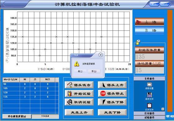 試驗開始時,首先選擇試驗方法,估計一個初始質(zhì)量和Δm值,進行試驗,如果第一個試樣破損,用砝碼Δm減少落體質(zhì)量;如果第一個試樣不破,須用砝碼Δm增加落體質(zhì)量依此進行試驗。總之,利用砝碼減少或增加落體質(zhì)量,取決于前一個試樣是否破損。20個試樣試驗后,計算破損總數(shù)N,如果N等于10,試驗完成;如果N小于10,補充試樣后,繼續(xù)試驗直到N等于10;如果N大于10,補充試樣后,繼續(xù)試驗直到不破損的總數(shù)等于10為止,最后由系統(tǒng)自動計算沖擊結(jié)果。
