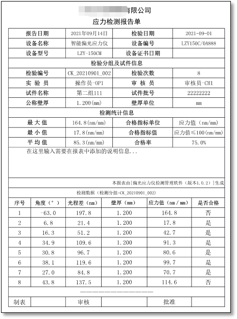 • 檢測報告輸出:使用“PDF”格式或“XPS”格式文件輸出不可更改的檢測報告,檢測報告中包含公司信息、檢測信息、設備信息、樣品信息、批次的最大值、最小值、平均值和合格率。