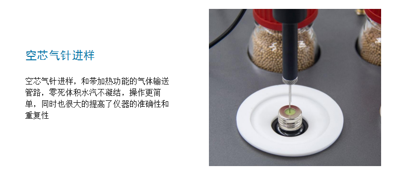 - 空芯氣針進樣,和帶加熱功能的氣體輸送管路,零死體積水汽不凝結,操作更簡單,同時也很大的提高了儀器的準確性和重復性;